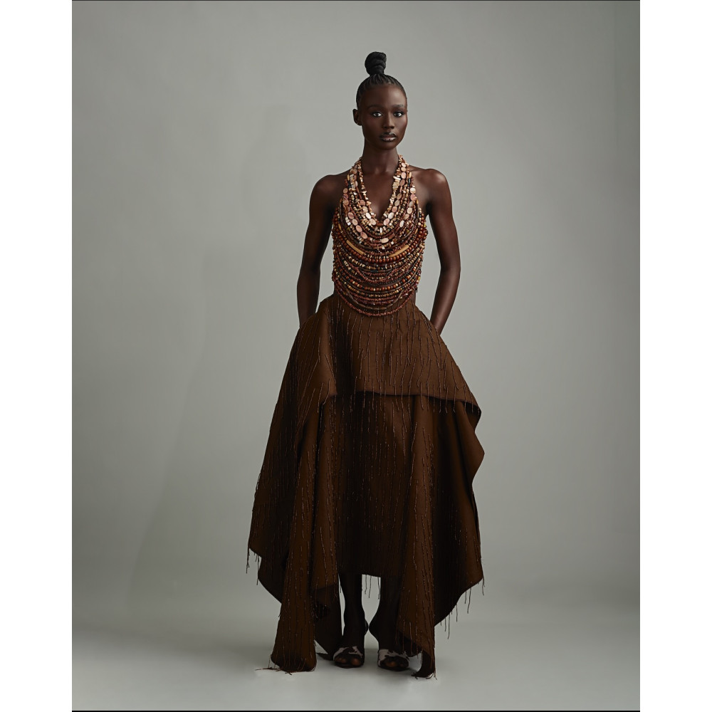 A study in sculptural adornment, the EWA NECKLACE TOP merges garment and jewelry into a single, striking form. It is crafted on breathable fabric, allowing the hand-beaded neckline to take center stage.