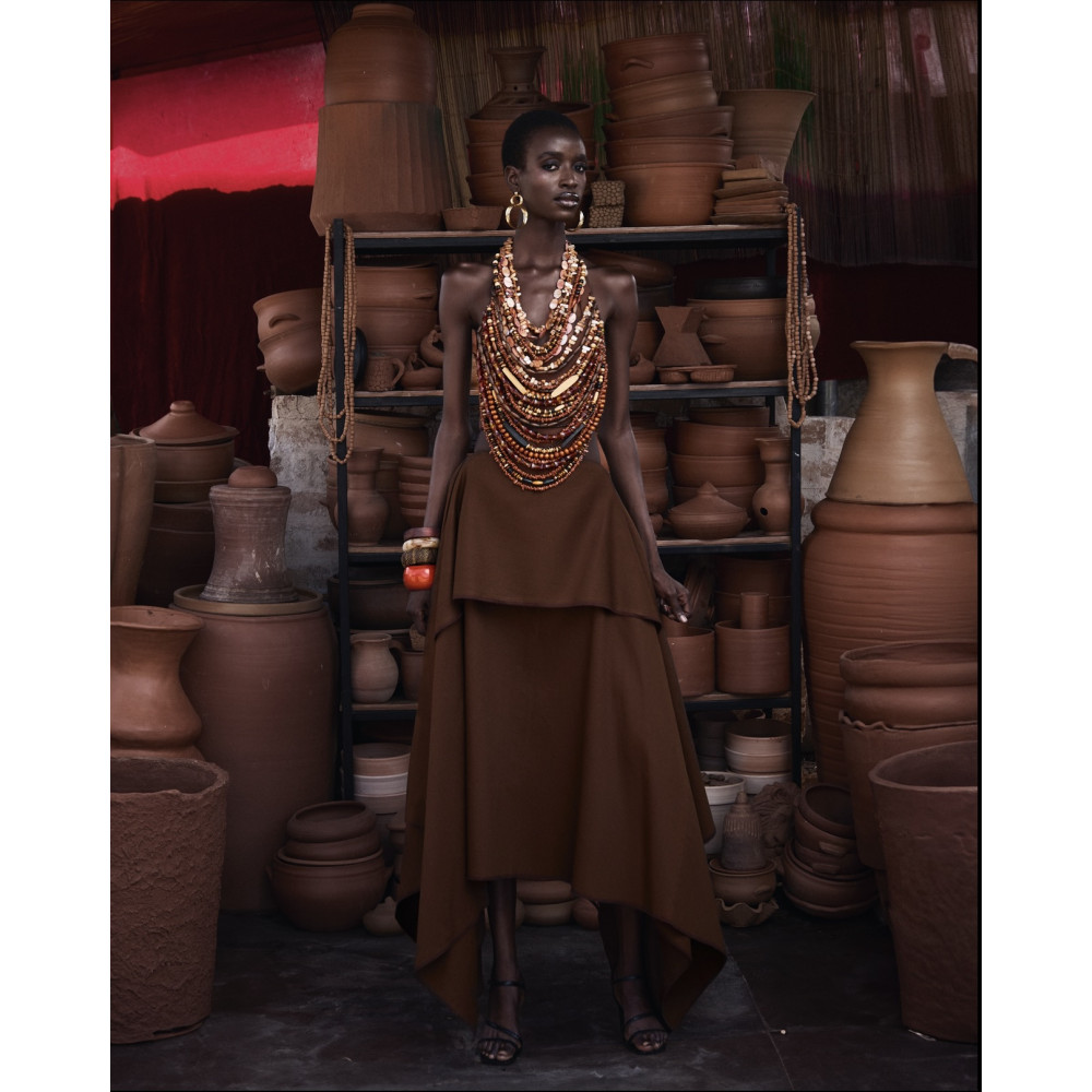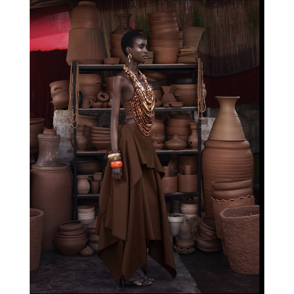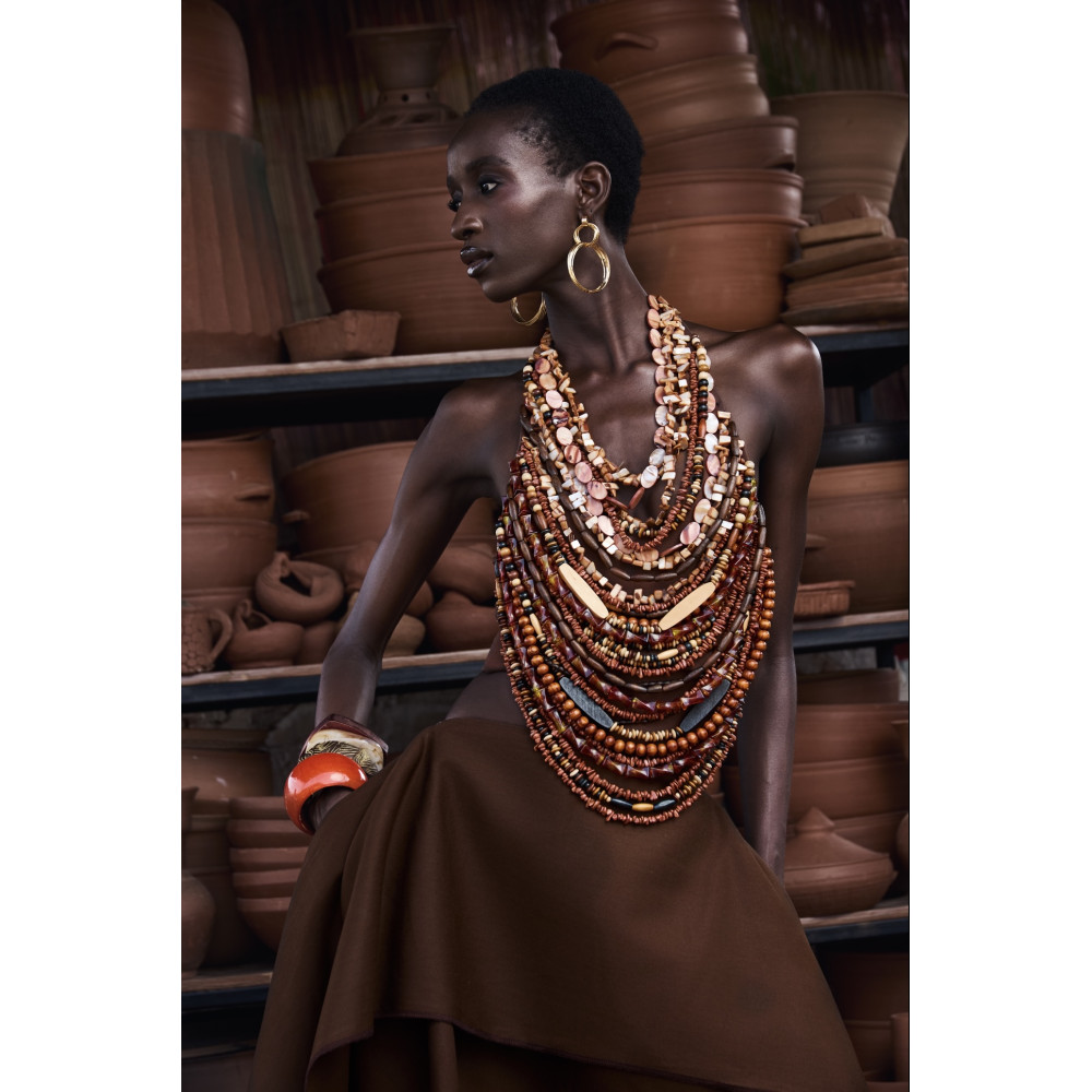 The integrated necklace detail delicately covers the front of the top, creating a layered effect without the need for additional styling. Designed to elevate both tailored and relaxed separates, EWA top is a limited edition masterpiece crowned with rare stones and hand carved wooden beads, due to the rarity of the gems featured on this piece no two Ewa tops are exactly the same.