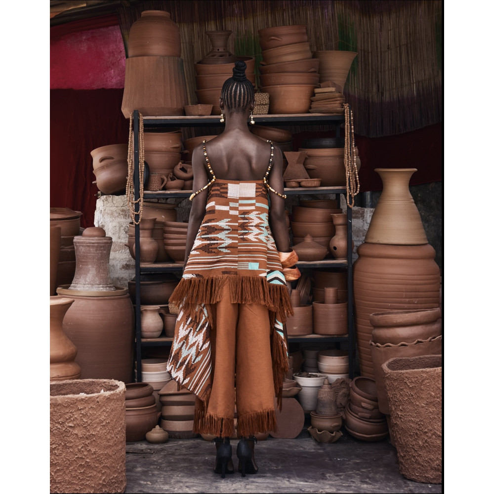 Rooted in heritage and reimagined for the modern wardrobe, the NENE AKWETTE SET celebrates the artistry of hand woven textiles. The top features an A-line cut that flows freely from the shoulders, finished with handwoven fringe along the hem that adds movement and visual rhythm. The hand-beaded detailing on the sleeves draws attention with quiet sophistication.
