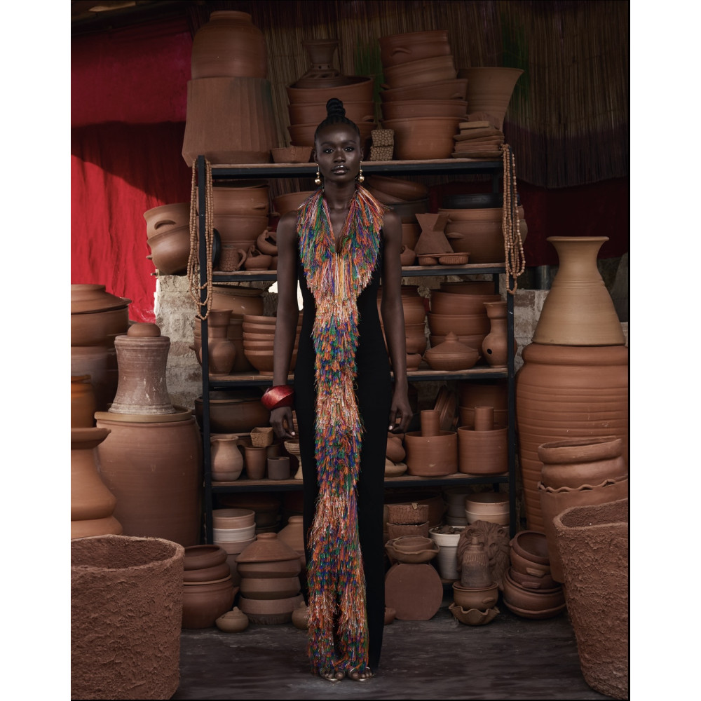 A halter-style neckline introduces the piece’s defining detail — layers of delicate fringe that begin at the neck and cascade down the body. The vibrant orange strands emerge, creating a striking vertical flow that draws the eye and moves effortlessly with every step. The interplay of texture, color, and motion gives the piece a bold yet refined presence, made for moments that call for impact.