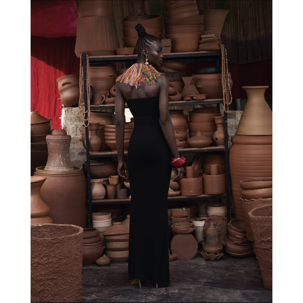 Designed to captivate through movement, the GOZI FRINGED DRESS is a study in contrast and fluidity. Cut in a body-skimming silhouette, the black base hugs the form with ease, creating a clean, elongated foundation.