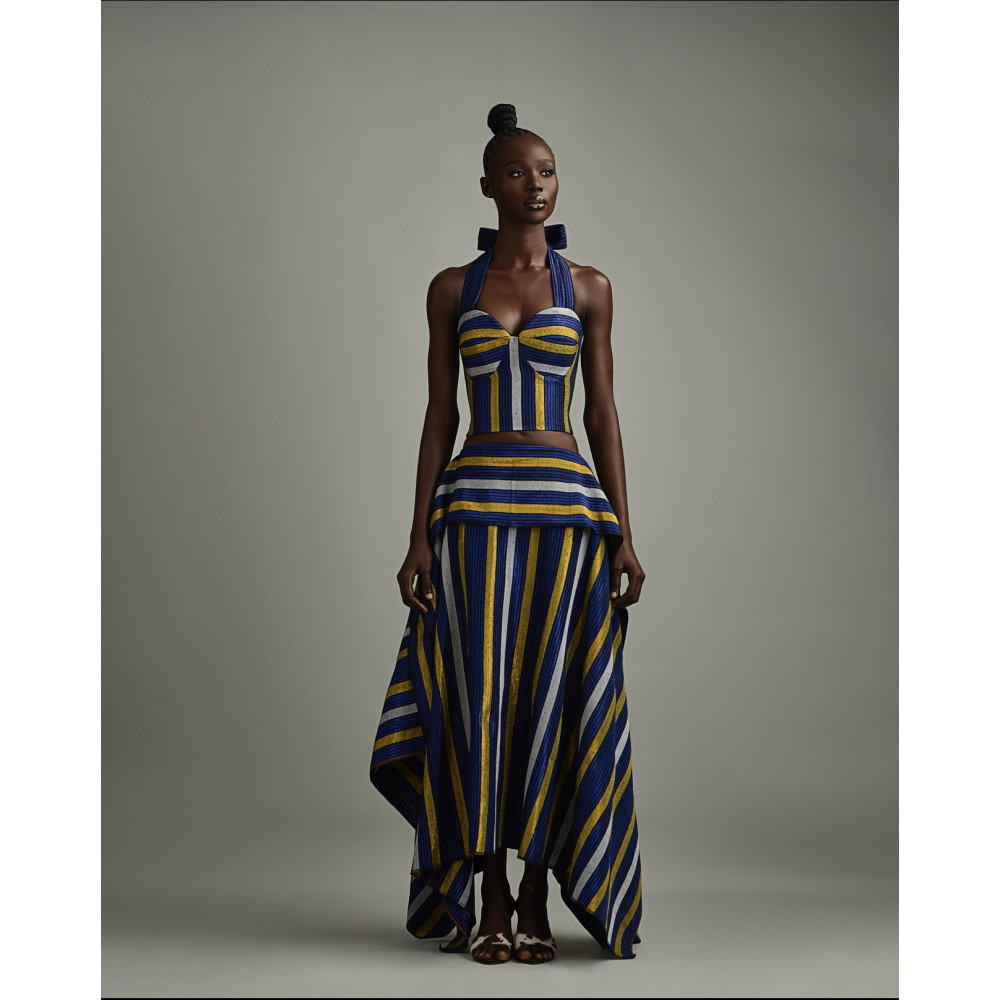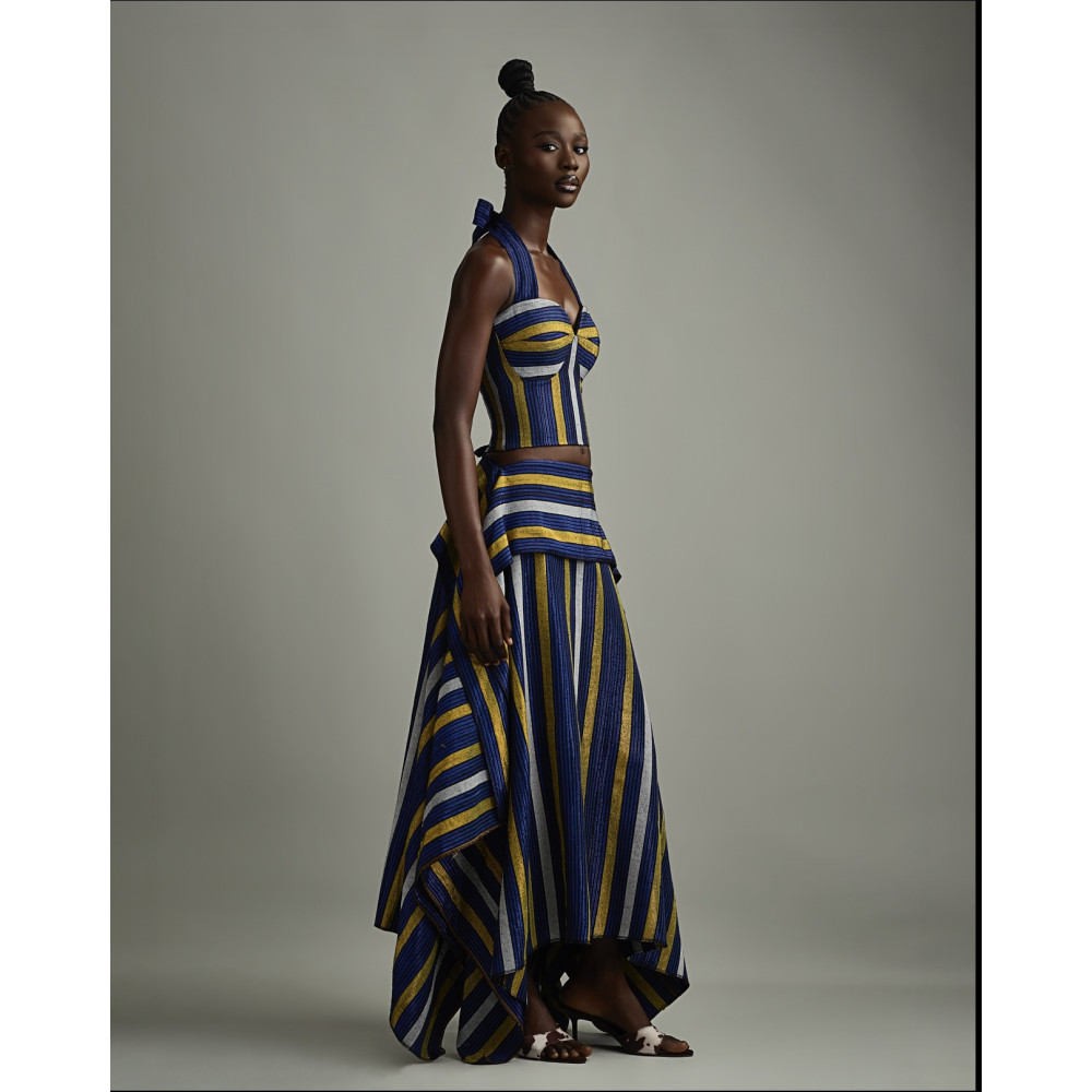 The Ure skirt in blue combines elegance with bold design. Crafted with matching vertical stripes, it features a unique asymmetric hemline that creates movement and visual interest. The layered waist detail adds dimension, making it a standout piece for both daytime chic and evening sophistication.