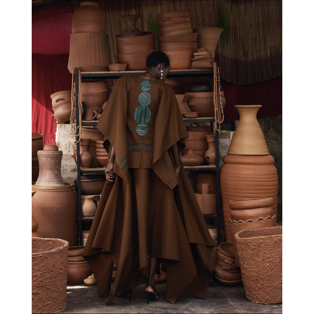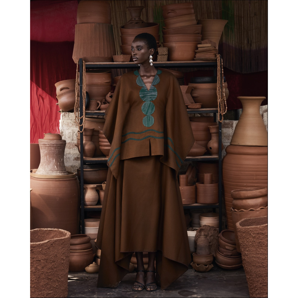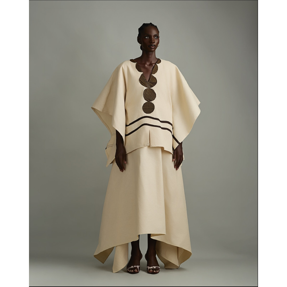 Inspired by tradition and shaped for the present, the AWKA DRESS combines clean tailoring with textured fabric. The silhouette is structured yet wearable, designed to flatter without restricting movement. The AKWA DRESS redefines elegance. The asymmetrical, free-flowing top drapes effortlessly, creating a fluid silhouette that is cinched at the waist with an inner belt, sculpting a flattering, snatched shape. The bottom layer flows with the body's natural movement. Crafted with signature handwoven detailing, this dress combines bold artistry with timeless elegance, making it perfect for any occasion.