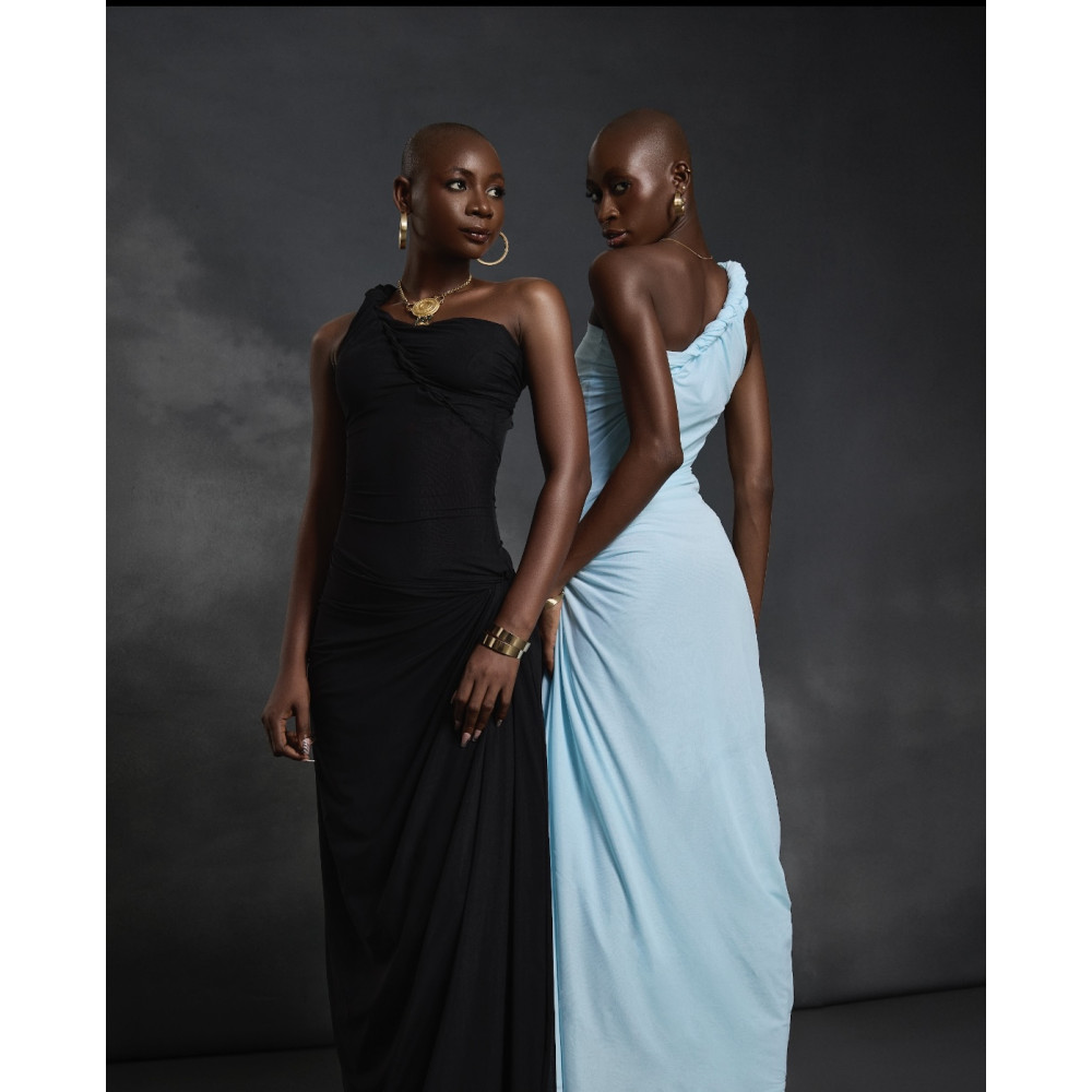 The Rabi monostrap dress: as a Nigerian born and bred designer Florentina constantly draws inspiration from her culture and reality, this piece is strongly inspired by a single wrapper tie she has seen young girls wear to the stream in her mother’s village. The Rabi dress features a single shoulder fit, adding a chic and asymmetrical touch to the design. It showcases a stylish silhouette, with a signature ruched waist detailing which is designed to embrace and enhance your curves making it a fashionable and eye-catching choice for events.